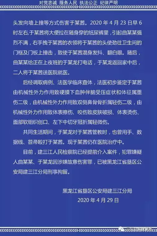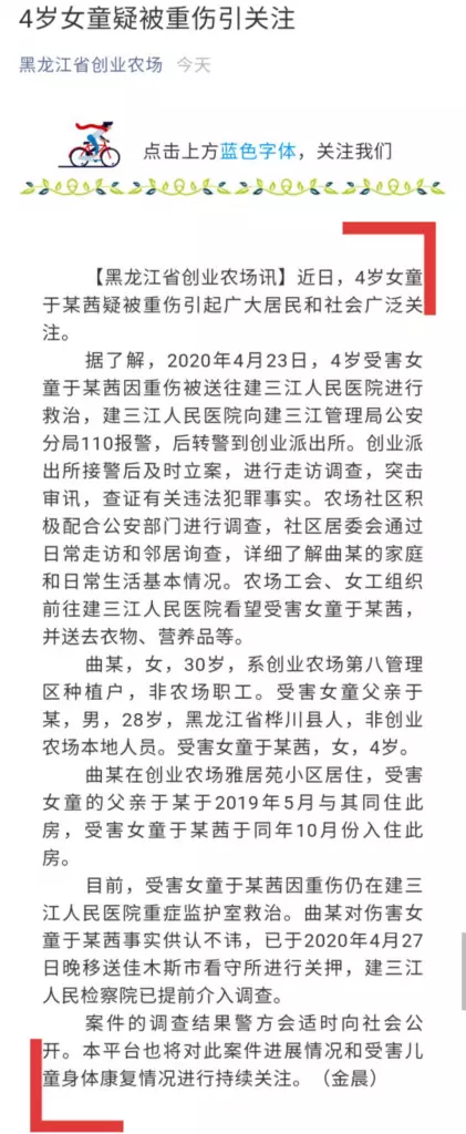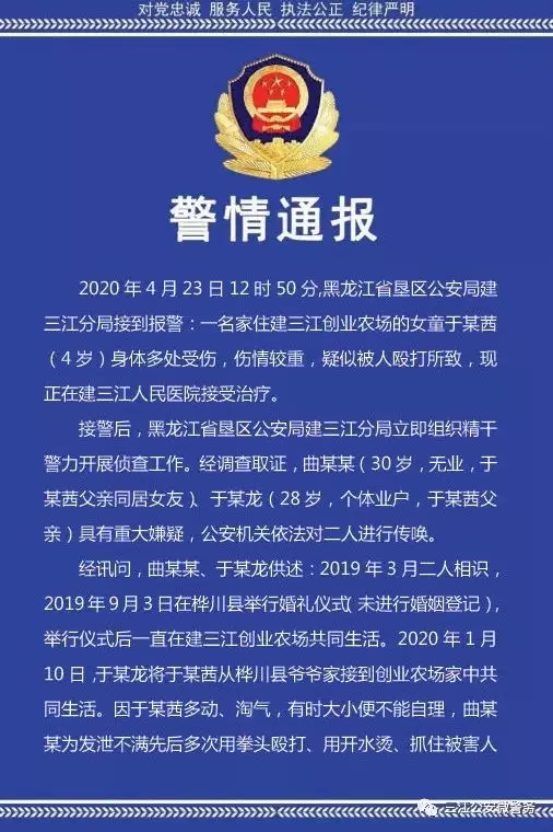 據了解,2020年4月23日,4歲受害女童於某茜因重傷被送往建三江人民醫院進行救治,建三江人民醫院向建三江管理局公安分局110報警,後轉警到創業派出所。