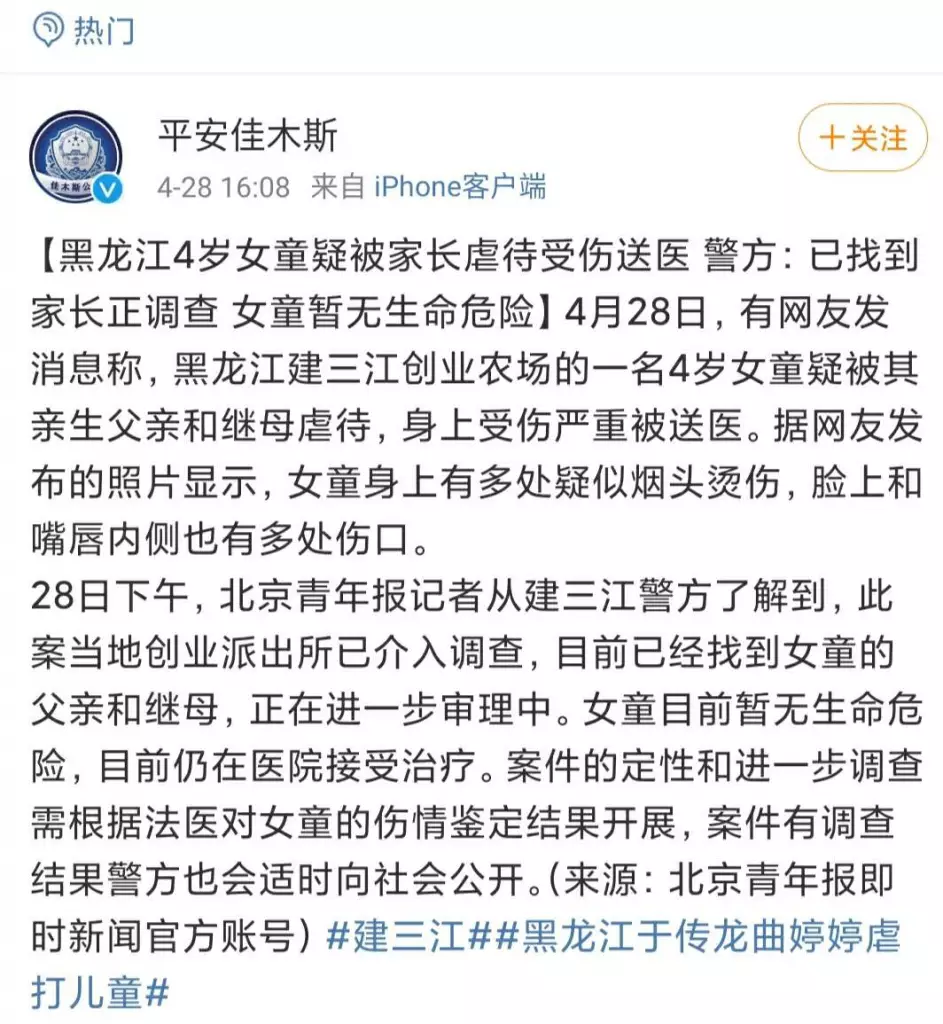 4月28日,網傳黑龍江佳木斯建三江創業農場一名4歲女童疑被親生父親和繼母虐待,身上多處疑被煙頭燙傷,臉上和嘴唇內側也有多處傷口。