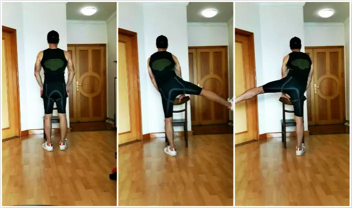 站立,手扶椅背平衡,腰部用力,向後抬起右腿,感覺腰部後面右邊肌肉收緊,到最高略停,然後慢慢放下,建議做15-20下,按腰部肌肉力量增減,換左腿再做。每腿做兩組。