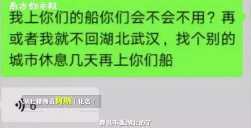 湖北籍海員阿明接受採訪時表示,想上船工作,目前找了四五十家船,中介回復一律都是目前湖北武漢的船員不能接收。具體問什麼原因,中介說船東也有難處,管控很嚴格。