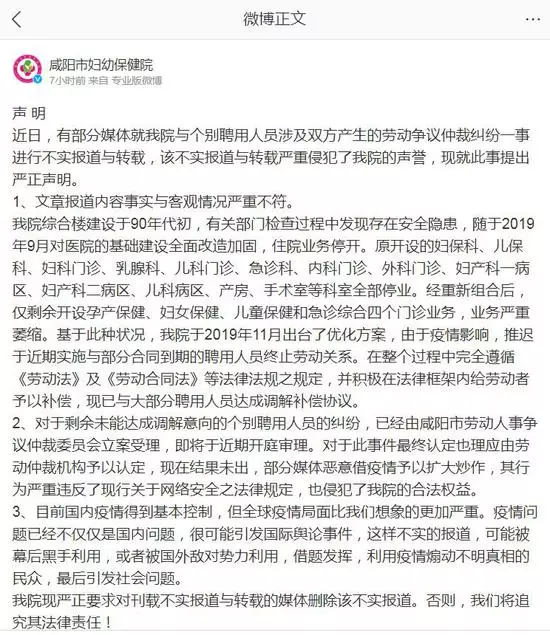 2、對於剩餘未能達成調解意向的個別聘用人員的糾紛,已經由咸陽市勞動人事爭議仲裁委員會立案受理,即將於近期開庭審理。對於此事件最終認定也理應由勞動仲裁機構予以認定,現在結果未出,部分媒體惡意借疫情予以擴大炒作,其行為嚴重違反了現行關於網路安全之法律規定,也侵犯了我院的合法權益。