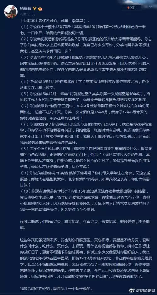 對現在廣泛宣傳的「養父」一說,鮑毓明表示,韓在15年就知道無法辦理收養,便提出到年齡結婚,並在此後多次主動示愛。“19年初還要我送鑽戒求婚,你拿我當過爸爸嗎?你一直擔心我和別的女人好,因為吃醋多疑和我吵架,天底下有不讓爸爸交女朋友的嗎?我還一直包容和遷就你,因為等你而至今單身。”