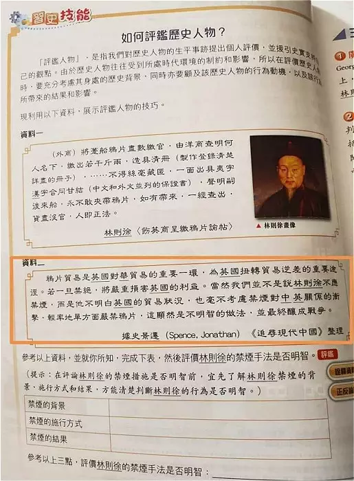 課文先引述林則徐要求英商繳鴉片的文言文諭帖,是一般學生很難看得懂的公文,亦無解釋英國向中國輸入毒品對國人的禍害。然後Spence Jonathan這段內容,竟然指林則徐禁鴉片沒有考慮到會損害到英國的利益,是不明智的做法。這如同叫人體諒一下毒販販毒也為了生計一樣。單是提供的資料,已經充滿了誤導性。