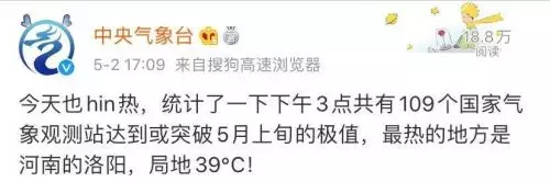 5月2日下午3點共有109個國家氣象觀測站達到或突破5月上旬的極值,最熱的地方是河南的洛陽,局地39℃。