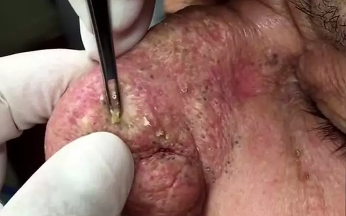 更誇張的是部分深藏於皮膚底層的濃瘡、「脂瘤」,要開刀割開皮膚,再用專業器具將瘡泡取出,血肉模糊。如讀者有興趣了解更多「暗瘡」專業處理手法,但切忌慎入!