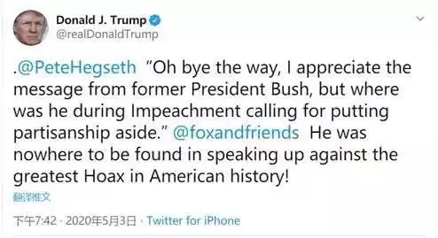 「@皮特•赫格塞斯,哦,順便說一下,我很欣賞前總統小布什傳遞出的信息,但在彈劾案期間,他又在哪兒呼籲拋開黨派之爭呢?」