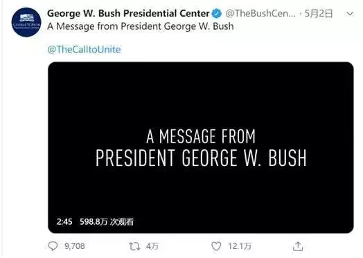 上週六(5月2日),「喬治•W•布殊總統中心」( George W. Bush Presidential Center)官方推特發佈一段時長約3分鐘的視頻。視頻中,小布殊敦促美國人謹記:「面對這一共同的威脅(指新冠疫情),我們的分歧是多麼渺小。」