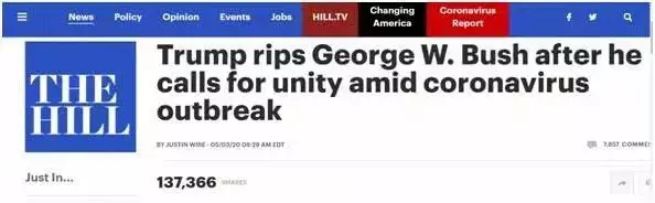 特朗普最近把矛頭對準了美國前總統喬治•布殊(小布殊)。《國會山報》報道稱,疫情當前,小布殊呼籲美國拋開黨派之爭、團結抗疫,隨後不久,特朗普立馬「對號入座」點名前者反問:在眾議院發起對自己的彈劾調查期間,他在哪兒呼籲拋開黨派之爭呢?!
