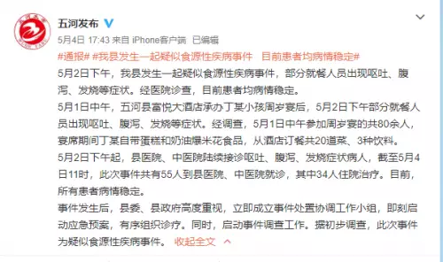 5月4日,安徽省五河縣縣委對外宣傳辦公室官方微博「五河發佈」通報,5月2日,該縣發生一起疑似食源性疾病事件,部分就餐人員出現嘔吐、腹瀉、發燒等癥狀。經醫院診查,目前患者均病情穩定。
