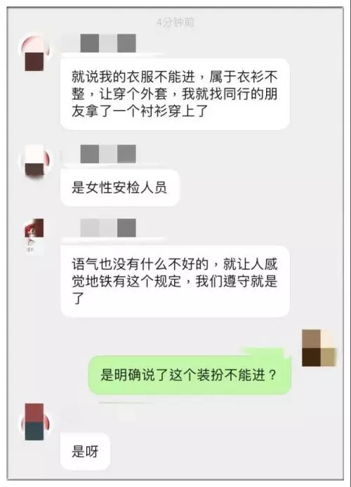 5月3日上午,網友「嘟嘟」在豆瓣發帖稱:她穿著弔帶裙進入地鐵時,被攔了下來。地鐵安保人員要求她穿上外套才可以進入地鐵。