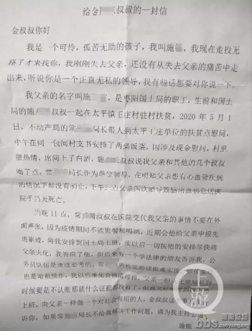 發帖人自稱是施某某之子施某,貼文稱,施某某是國土部門職工,在棗陽太平鎮王莊村駐點。5月1日,常某某帶隊來到王莊村慰問。午飯時,施某某和其他人喝了白酒。下午3時許,施某某因飲酒導致腦出血病危,送醫搶救無效死亡。