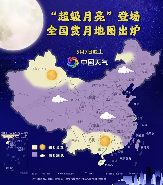 能幸運與「超級月亮」相約的是廣東、廣西、海南、雲南、貴州南部、湖南南部、江西南部、新疆中北部。大城市中,昆明、貴陽、南寧、廣州、海口、烏魯木齊、香港、澳門都能欣賞到一輪圓月。