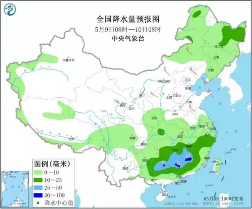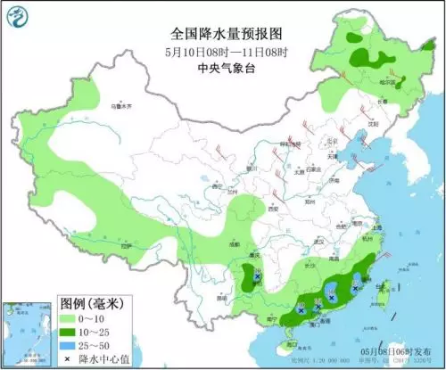 10日08時至11日08時,內蒙古東北部、東北地區中北部、新疆伊犁河谷和南疆盆地、西藏大部、江南中南部、西南地區東部和北部、華南、台灣島等地部分地區有小到中雨,其中,江西南部、福建東南部、貴州中部、廣西東南部、廣東中北部等地部分地區有大雨(25~40毫米)。