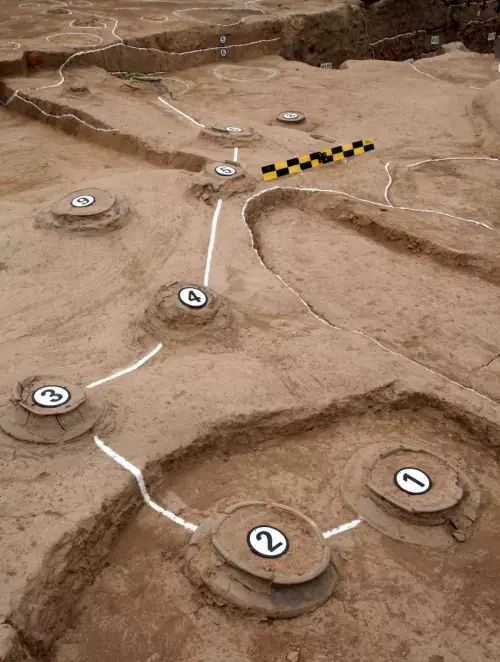 在雙槐樹遺址的中心居址區內,記者看到了用九個陶罐擺放成北斗星形狀的天文遺迹。陶罐埋在土中,只露出一小部分,考古人員一一貼上了數字標號。如果沒有顧萬發深入淺出又妙趣橫生的講解,很難想像這看似平淡無奇的場景所蘊含的無窮奧妙。