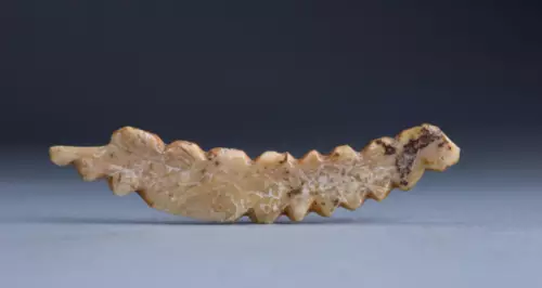 這件藝術品長6.4厘米,寬不足1厘米,厚0.1厘米,用野豬獠牙雕刻而成,是一條正在吐絲的家蠶形象。它的做工十分精緻,腹足、胸足、頭部組合明晰,和現代的家蠶極為相似,同時背部凸起,頭昂尾翹,與蠶吐絲或即將吐絲時的造型高度契合。