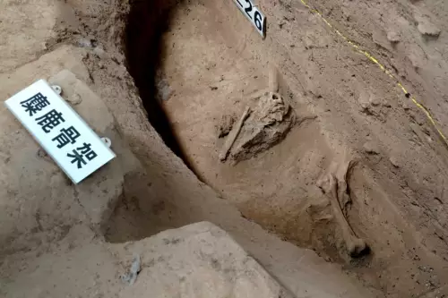 在北斗九星遺迹上端,北極附近——古人認為北極是天的中心,還有一頭首向南並朝著門道的完整麋鹿骨架。麋鹿在古人眼裏是一種神奇的動物。古代有天子冬至祭天的傳統,大部分鹿類在夏天脫角,只有麋鹿在冬至脫角,所以統治者把麋鹿脫角視為吉祥的象徵,並把麋鹿與一年最重要的節氣冬至關聯。此外,道教有「三蹻」的說法,指龍虎鹿三神獸,它們是幫助神巫上天的橋。顧萬發認為,麋鹿也應有鹿蹻的意思。