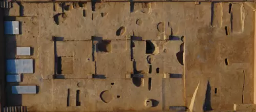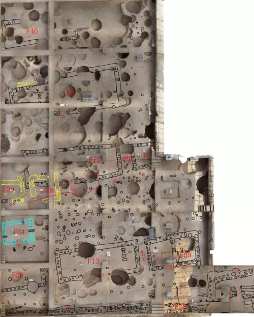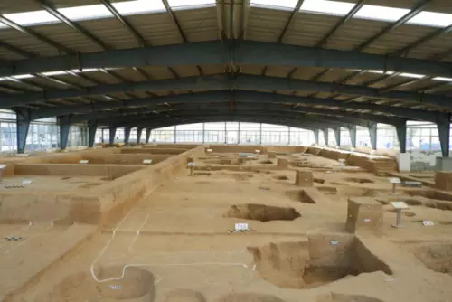 還有一處特殊遺迹,專家們至今難以定性。該遺迹位於大型居住中心基址前面,現存多排,已發現100多米,採用了當時中國最為先進的土木工藝法式——版築法,類似現代鋪地板磚,而且使用跨度很長,可能是一處公共場所,這種佈局頗有「前殿後寢」的樣子。