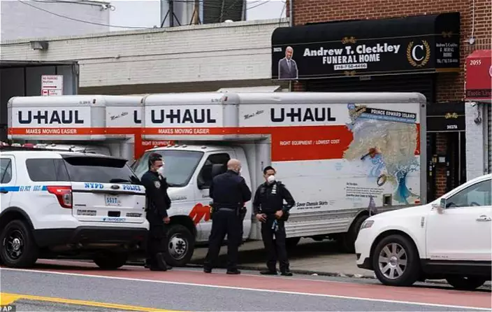 美國紐約殯儀館外冷藏車中,屍積如山。