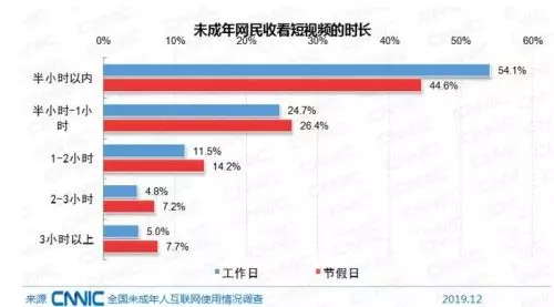 2019年未成年網民在互聯網上經常收看短視頻的比例達到46.2%,較2018年的40.5%提升5.7個百分點,僅次於聽音樂和網路遊戲,成為使用最普遍的網路娛樂之一。