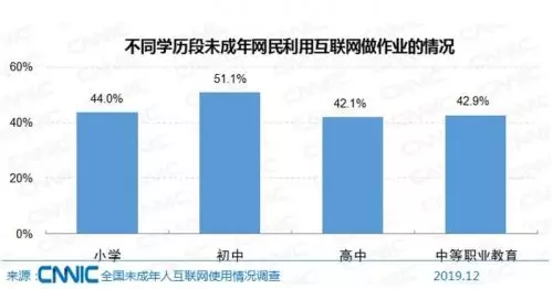 但報告調查結果顯示,51.1%的初中生網民曾利用互聯網完成過作業,比例明顯高於其他學歷段。這一比例在小學生網民中為44.0%,高中生網民中為42.1%,中職學生網民中為42.9%。