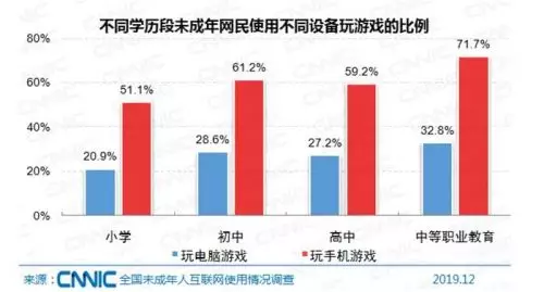 各學歷段未成年網民玩手機遊戲的比例均在五成以上,小學生網民玩手機遊戲的比例達到51.1%;初中和高中生網民分別為61.2%和59.2%;中職學生網民達到71.7%。