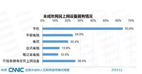 未成年網民中擁有屬於自己上網設備的比例達到74.0%。手機擁有比例最高,達到63.6%;其次為平板電腦,為24.0%。