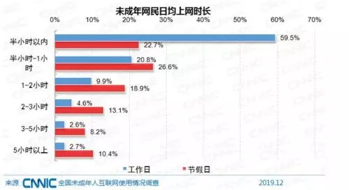 在上網時長上,未成年網民工作日日均上網時長在2小時以上的為9.9%,節假日日均上網時長在5小時以上的為10.4%。報告指出,未成年網民可能受到過度使用互聯網帶來的不良影響。