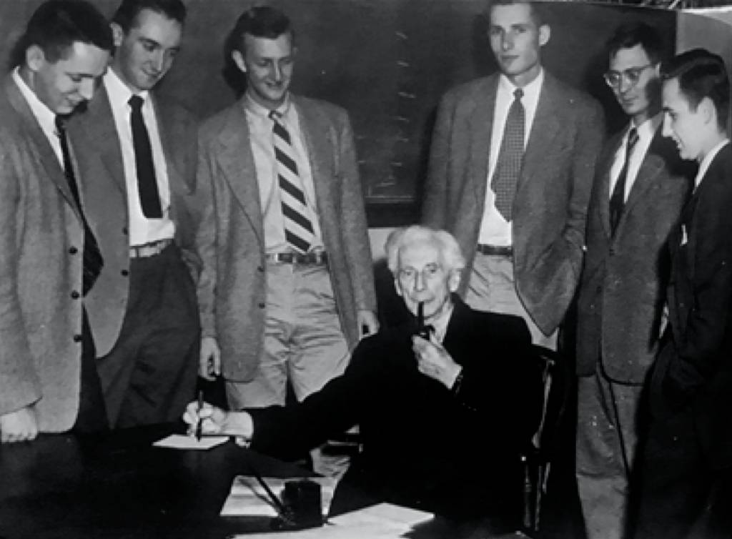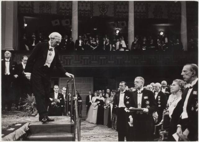 1950年,羅素在普林斯頓大學得知榮獲諾貝爾獎後留影。