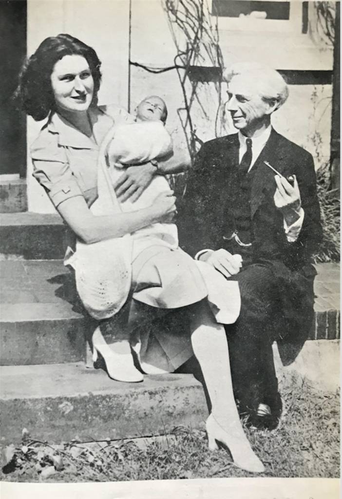 羅素與第三任妻子海倫-帕特里夏·斯彭斯,抱著剛出生的兒子康拉德。