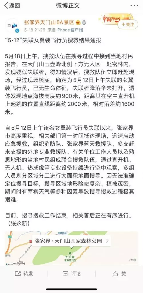 5月18日上午,搜救隊伍在搜尋過程中接到天門山鎮村民報告,在天門山玉壺峰北側下方無人區一處密林內,發現疑似失聯者。得知情況後,搜救隊伍立即趕赴現場,經過現場核實,確定為5月12日上午失聯的女翼裝飛行員,已無生命體征,失聯者降落傘未打開。遺體發現地點海拔高度約900米,距離其在空中直升機上起跳的位置直線距離約2000米,相對落差約1600米。