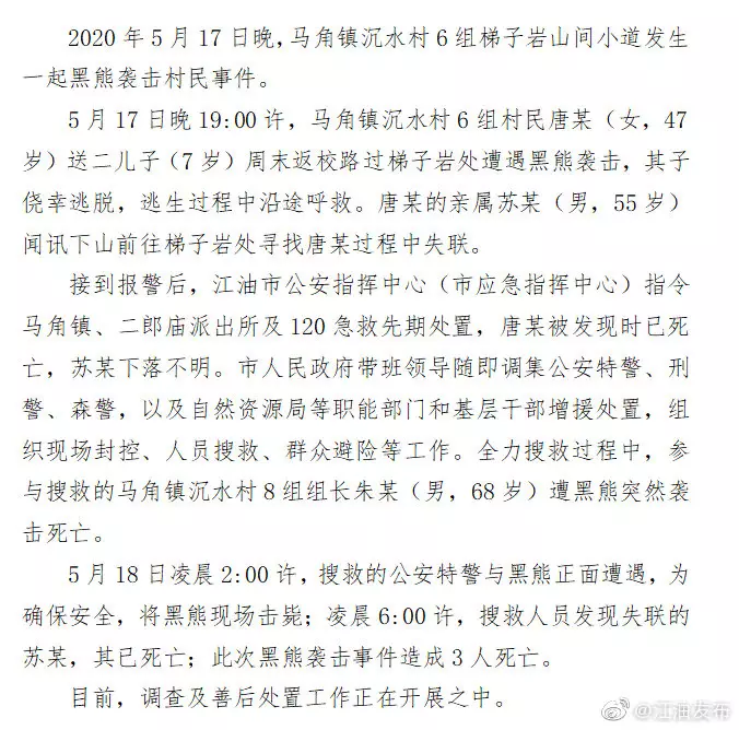 根據官方通報,5月17日晚7時許,江油市馬角鎮沉水村一對母子在周末返校途中被黑熊襲擊,7歲的男孩得以逃脫,其母和先後聞訊趕來的兩名中老年男子遭黑熊襲擊身亡。