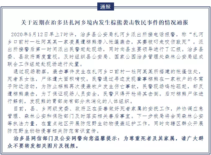 5月12日和5月17日,青海玉樹治多縣和四川綿陽江油市接連發生兩起熊襲擊人事件,分別造成1人和3人死亡。人熊衝突的話題躍入人們的視野。