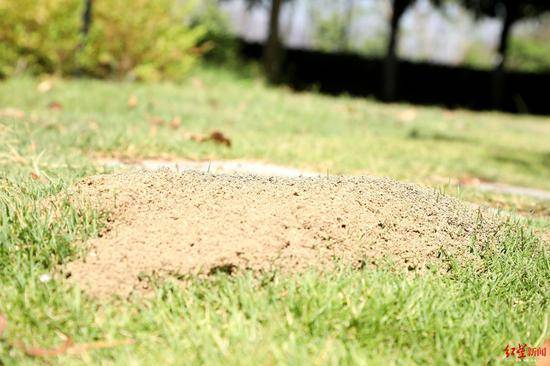 紅星新聞記者在綠地範圍內隨機尋找,僅十餘分鐘,就找到大小不一的紅火蟻蟻巢16個。當用木棍翻開一個蟻巢時,成千上萬的紅火蟻瞬間顯露,四處爬散,巢里還有許多白色的蟻卵。