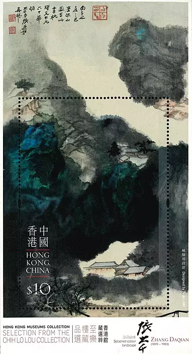 小型張展示張大千於一九六六年繪畫的《潑彩山水》,乃張大千為祝賀何耀光先生六十大壽而作。當時張大千正居於巴西,此畫為其晚年成熟風格之潑彩精品。畫作以青綠水墨作大幅潑墨,境界淋漓盡致,以特別郵票紙張印製格外珍貴。這些畫作以自然山水為題,當下細心欣賞,既可暫時忘卻煩憂,更可感受自然之美。