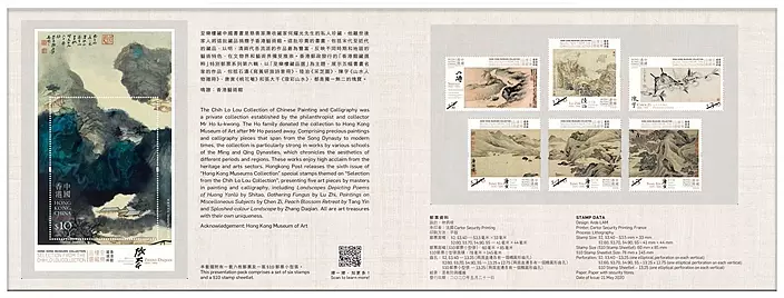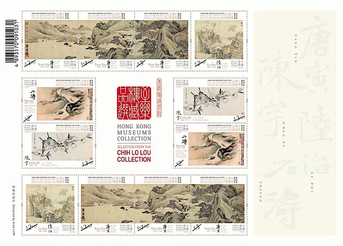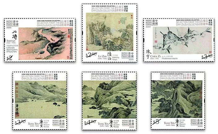 是次推出的「至樂樓藏品選」特別郵票,將重現五幅難得一見的稀世畫作,包括石濤《寫黃研旅詩意冊》、張大千《潑彩山水》、唐寅《桃花菴》,另外還有陸治《采芝圖》和陳字《山水人物雜冊》。透過精美郵票,大家將能細意品味國畫大師們的精湛畫技。