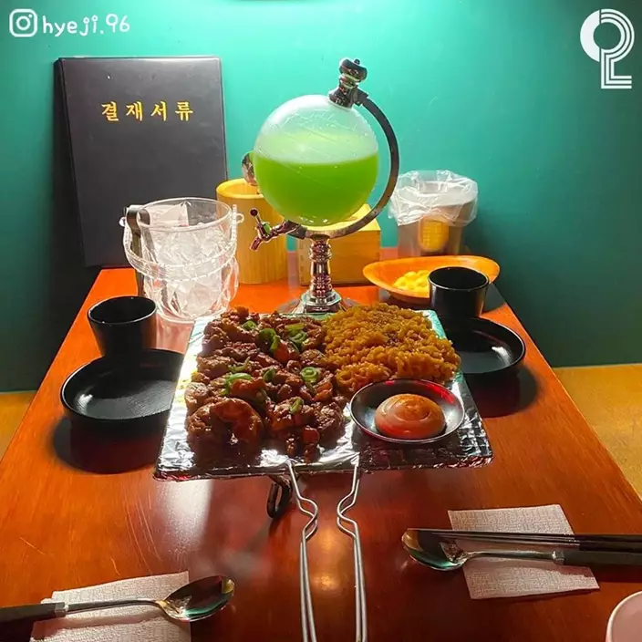 當中最吸睛的當然就是這個地球儀形狀的自助燒酒桶了,看起來就十分適合裝入瓊漿玉液,注入哈密瓜口味的燒酒之後整個球體更是晶瑩剔透,十分好看。