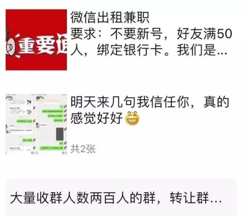 不法分子在朋友圈發佈收購微信帳號、微信群的虛假廣告。