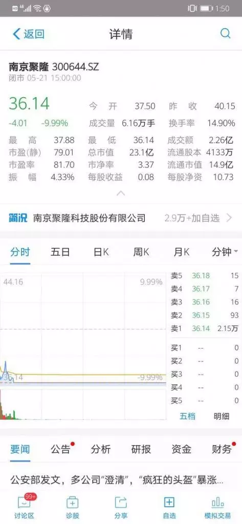 5月21日,南京聚隆股價應聲下跌,截至收盤報36.14元,下跌9.99%;國立科技以10元3毛6分收盤,下跌5.22%。