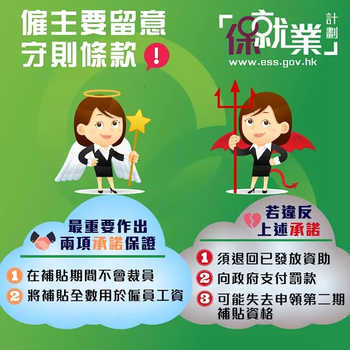「保就業」計劃明日(25日)開始接受申請,政府在專用網站 www.ess.gov.hk 上載計劃的常見問題和守則條款,並在添馬台Facebook提醒僱主提交網上申請表時須簽署承諾書,承諾並保證在補貼期間不會「裁員」,及把計劃下的工資補貼全數用於支付補貼期內相關月份的僱員工資,否則須向政府退回全數或部分任何已發放的資助或罰款。