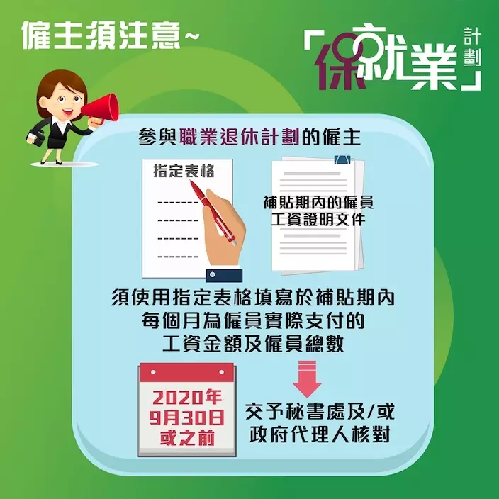- 就參與職業退休計劃的僱主,「保就業」計劃秘書處或政府代理人會以申請者遞交於補貼期內每個月的僱員工資證明文件所顯示的受薪僱員總數及工資,核對有關僱主有否在補貼期間把工資補貼全數金額用於僱員工資,並對比在申請表內填報的2020年3月僱員總數,以核對有關僱主有否「裁員」。 僱主需要使用指定表格填寫於補貼期內每個月為僱員實際支付的工資金額及僱員總數,並於9月30日或之前提交予政府代理人。