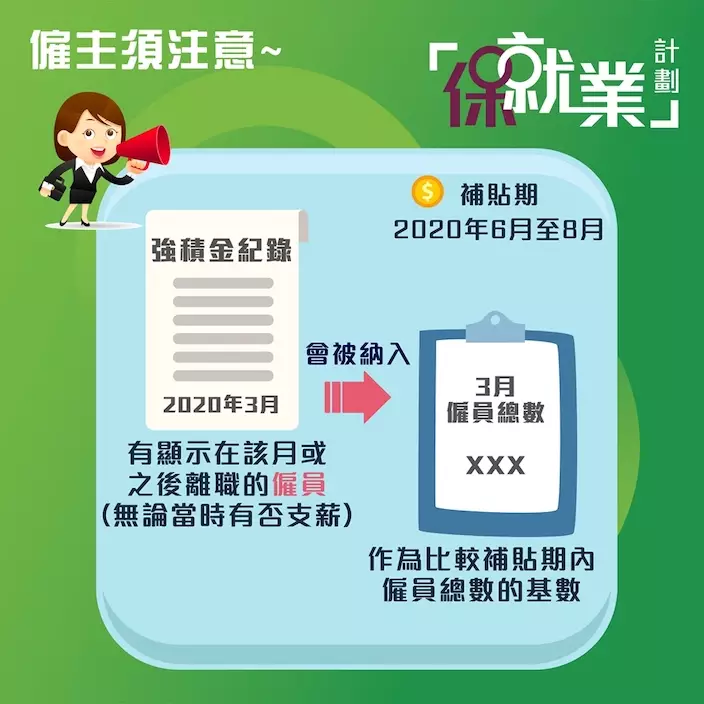 - 若2020年3月的強積金紀錄證明書有顯示在該月或之後離職的僱員(無論當時有否支薪),會被納入2020年3月的僱員總數,作為比較補貼期內僱員總數的基數。