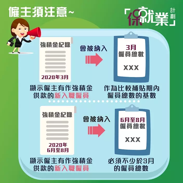 - 若申請者有為新入職僱員於2020年3月作強積金供款,而該月的強積金紀錄證明書亦顯示有關僱員,有關僱員會被納入計算2020年3月的僱員總數,作為比較補貼期(即2020年6月至8月)內僱員人數的基數。同樣地,若在補貼期內任何一個月的強積金紀錄證明書顯示申請者有為新入職僱員供款,有關僱員亦會被納入計算該月受薪僱員總數。