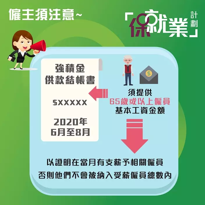 - 就65歲或以上的僱員而言,獲批補貼的僱主向強積金受託人提交2020年6月至8月供款的付款結算書時,須就65歲或以上僱員提供其基本工資金額,以證明在當月有支薪予相關僱員,否則有關僱員不會被納入受薪僱員總數的計算內。