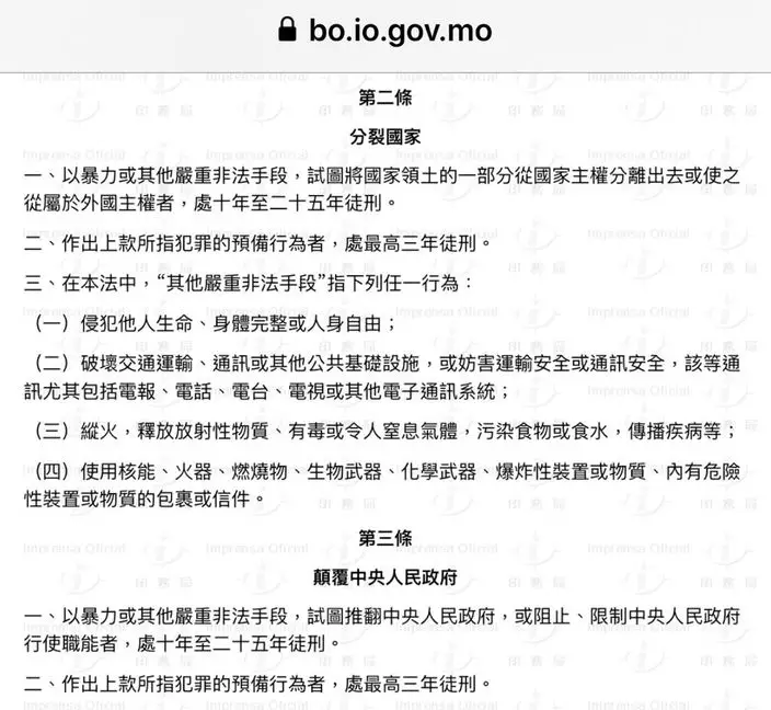 就香港過去沒有的分裂國家罪,澳門分裂國家罪是「以暴力或其他嚴重非法手段,試圖將國家領土的一部分從國家主權分離出去或使之從屬於外國主權者,處10年至25年徒刑。」