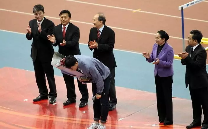 劉翔在國家體育總局人員陪伴下現身110米欄跑道,現場即播放劉翔職業生涯的紀錄短片,之後國家體育總局副局長肖天為劉翔頒發了中國田徑傑出貢獻獎。