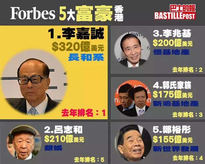 2014年福布斯香港富豪榜出爐,現年85歲的「超人」李嘉誠以320億美元(約2,496億港元)的資產,再度登上富豪榜首位。近期因濠賭股熱炒而身家暴漲的銀娛(0027)主席呂志和,身家總值210億美元(約1,638億港元),排行第二,連續第二年翻一番。恒地「四叔」李兆基下跌一位排第三,身家200億美元。