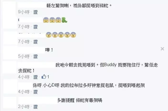 資料顯示,眼鏡蛇是「眼鏡蛇科」的一種,科下約有23個品種如埃及眼鏡蛇,過山烏,所有眼鏡蛇的品種都有致命的毒液,會導致不同程度的傷害。市民若發現蛇出沒,不應自行驅趕或捕捉,應立即致電999求助。