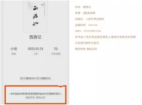 日前,某網文平台在《西遊記》首頁標註「本作品由作家(明)吳承恩授權製作發行」「版權所有·侵權必究」“簽約”“VIP”等字樣,另有讀者在閱讀《紅樓夢》時收到“曹雪芹邀請購買付費章節”等邀約,此事一經曝光引發廣泛關注。