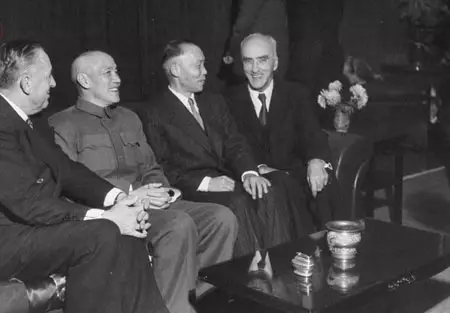 美國特使經濟合作總署署長保羅·霍夫曼,蔣介石,李宗仁和美國大使司徒雷登坐在沙發上。