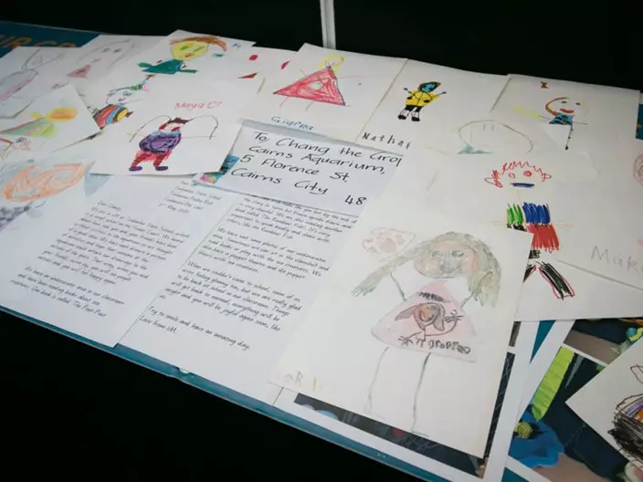 所幸當地一所州立小學的學生得知這個消息之後,立刻伸出援手,紛紛創作自己的自畫像寄到水族館為Chang打氣。工作人員將這些畫作貼在魚缸的玻璃上,Chang看到之後果然從洞穴裡游了出來,十分認真地觀看了這些畫,似乎也恢復了一些活力。